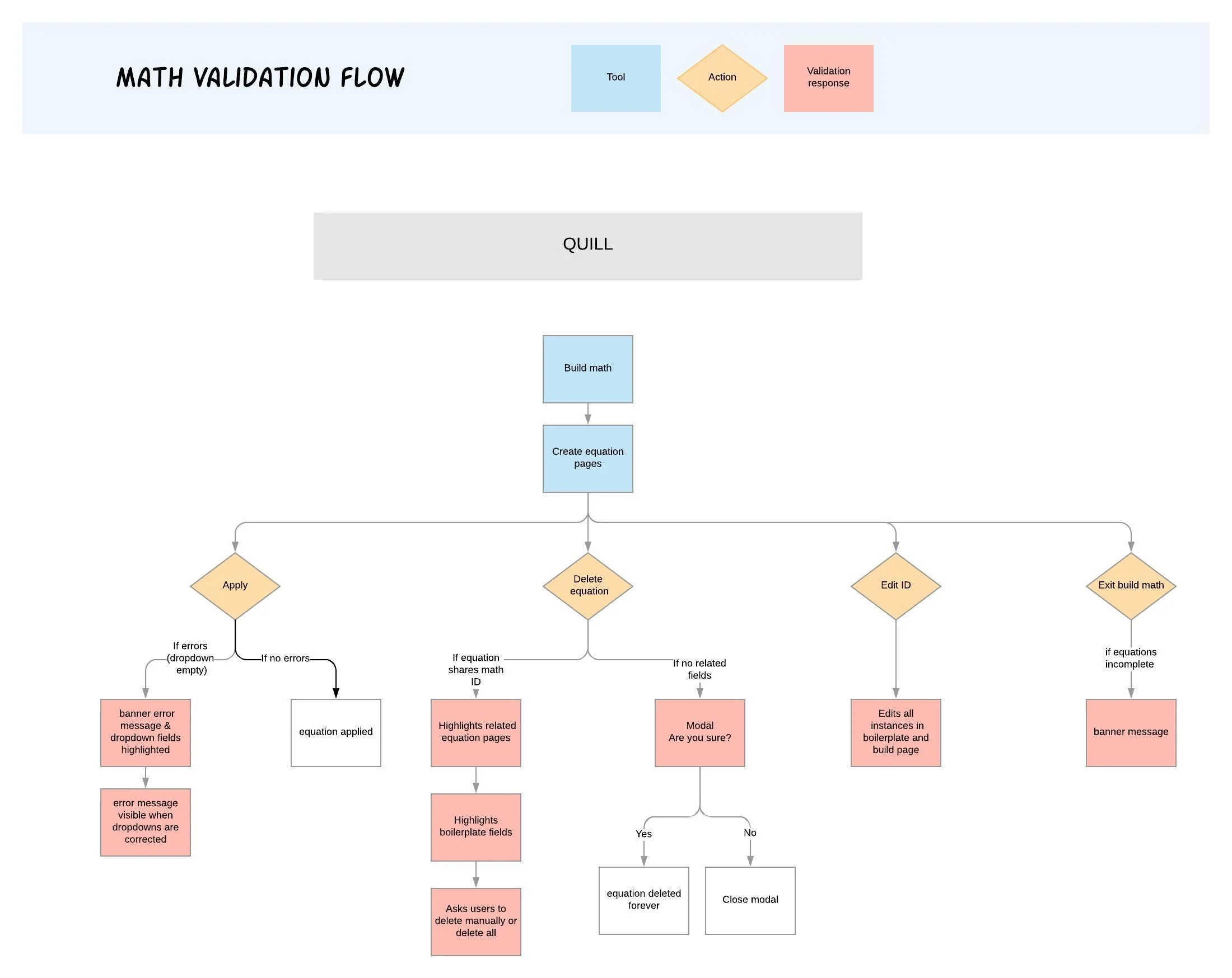 This diagram shows a quill artist’s experience when creating erroneous equations. Purpose of validation is to ensure templates do not become corrupt. A quill artist is responsible for setting up the logic of their document template. Design is responsible for notifying the quill artist when they’ve made a mistake in the system they are trying to create.